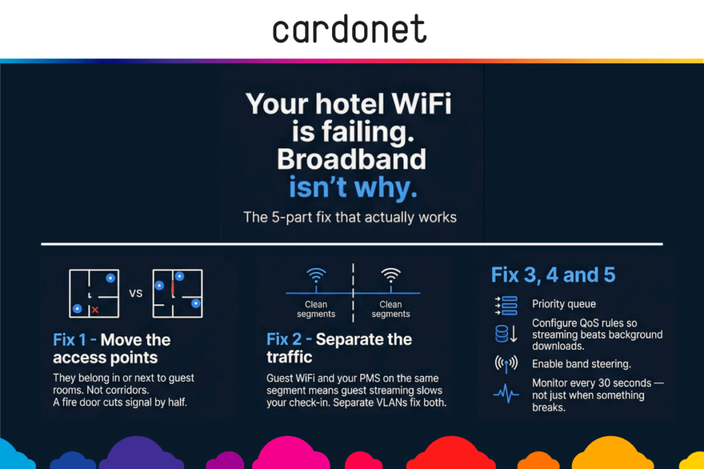 When your guest WiFi and your PMS share the same network segment, peak demand at 9pm on a Friday impacts your check-in system and front desks grind to a halt because the majority of guests are streaming simultaneously, not because the internet was down. Guest WiFi, staff devices, the PMS, POS terminals, CCTV, and smart room controls need to sit on separate VLANs.