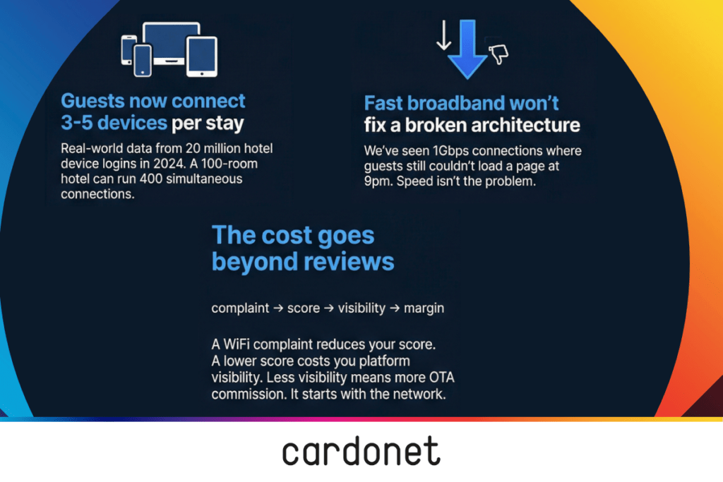 The financial chain runs longer than most GMs realise. WiFi complaints will reduce your overall score which will reduce visibility on booking platforms, resulting in more reliance on traditional, expensive channels. The WiFi problem that looked like a guest satisfaction issue reduces your margins.